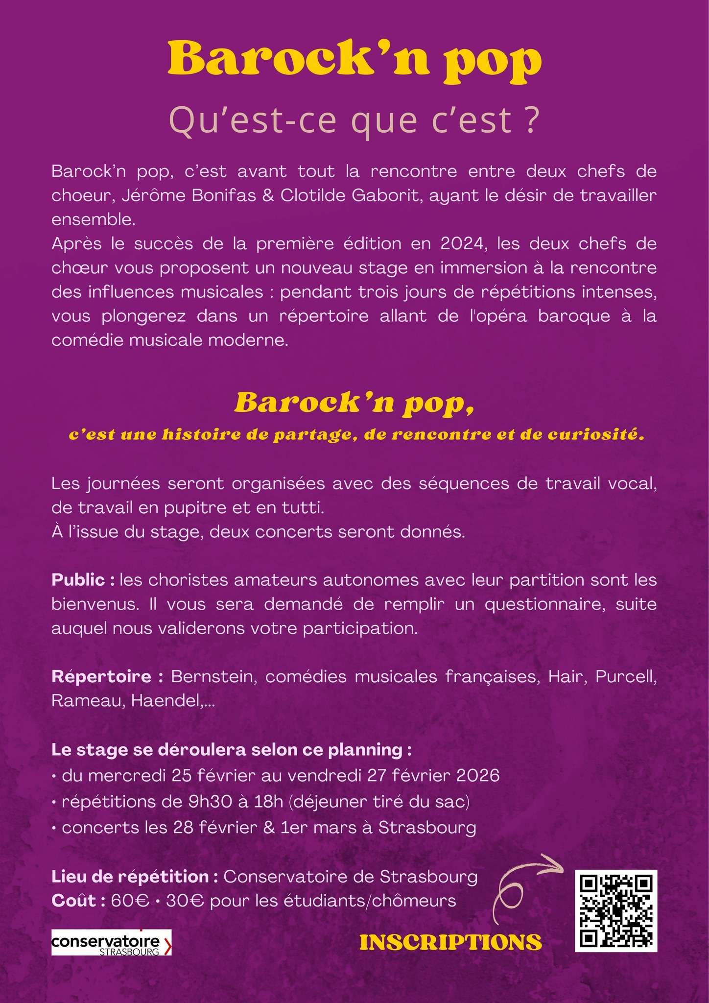 | Stage Barock n'Pop : Stage chant choral Jérôme BONIFAS et Clotilde GABORIT Mer. 25 Févr. Dim. 01 Mars 2026 Strasbourg (67) Répétitions (repas pris sur place) Mer. 25 Févr. Dim. 01 Mars 2026 Strasbourg (67) Répétitions (repas pris sur place) Infos & Contact barocknpop@gmail.com