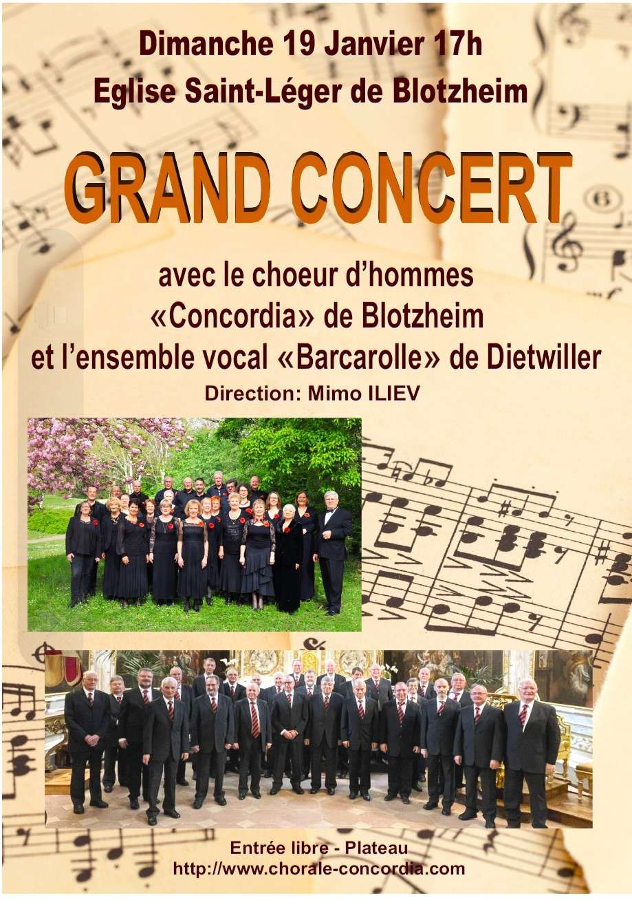 | Concert en région Le chœur d'hommes "Concordia" de Blotzheim présente son Grand concert Avec l'ensemble vocal "Barcarolle" de Dietwiller Dim. 19 Janv. 2025 17:00 à 20:00 Église Saint-Léger | Blotzheim (68) Terminé Dim. 19 Janv. 2025 17:00 à 20:00 Église Saint-Léger | Blotzheim (68) Terminé Informations supplémentaires Entrée libre | Plateau Pour aller plus loinSite web