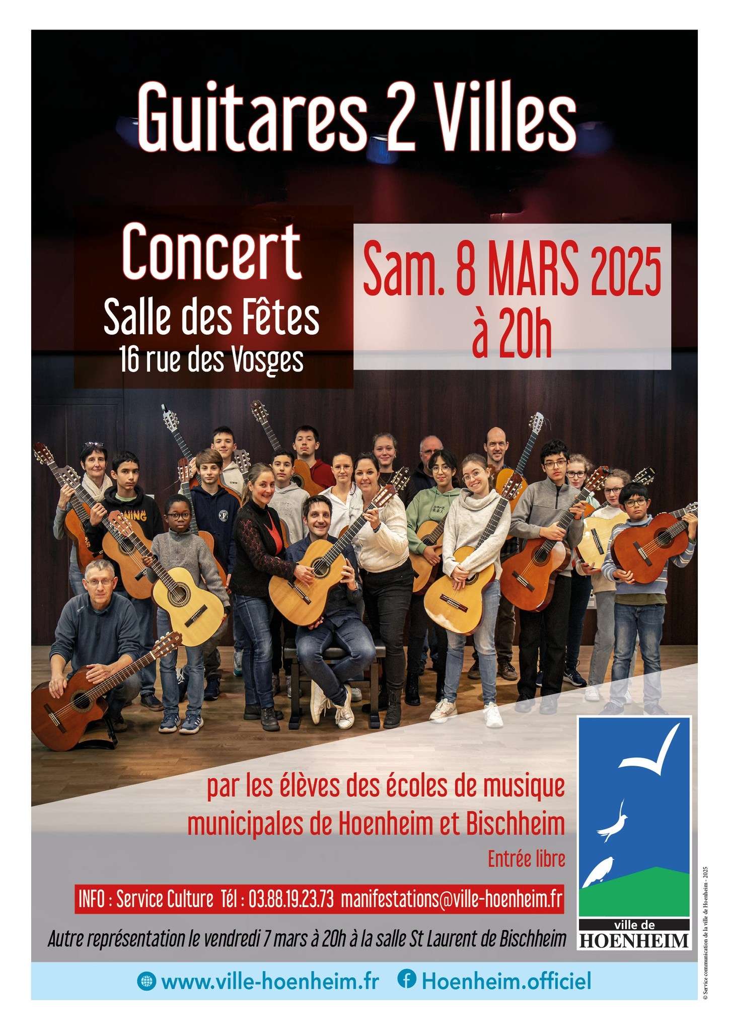 | Concert en région Les élèves des écoles de musiques municipales de Hœnheim et Bischheim présente leur Concert : Guitares 2 villes Sam. 08 Mars 2025 20:00 à 23:00 Terminé Sam. 08 Mars 2025 20:00 à 23:00 Terminé Infos & contact Service cultureTél : 03.88.19.23.73mail : manifestations@ville-hoenheim.fr