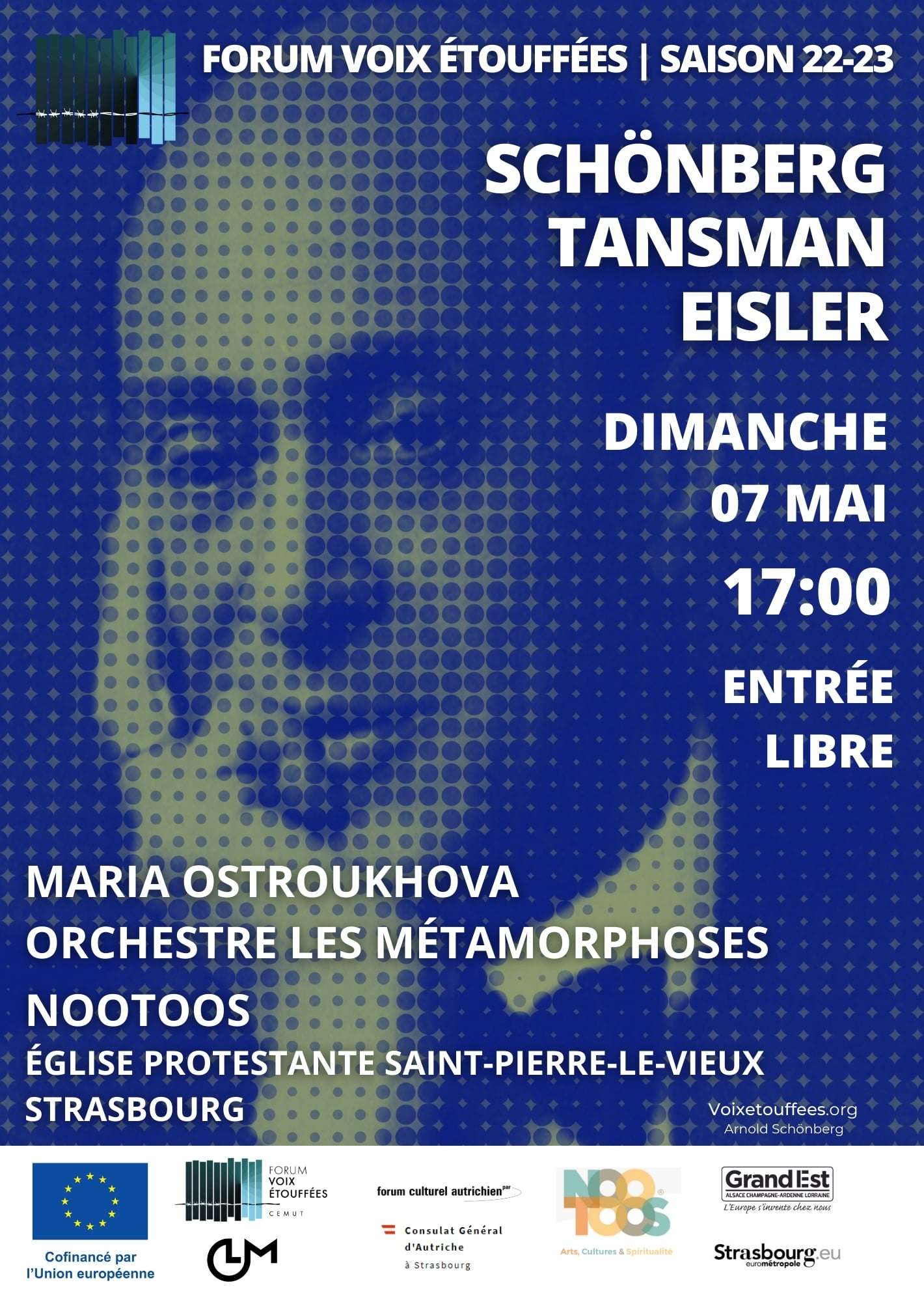 Le Forum Voix Étouffées vous invite au dernier concert de sa saison 2022-2023 à Strasbourg, celui-ci est à entrée libre, il servira d'évènement d'annonce pour la saison 2023-2024 ainsi que de lancement du projet Européen "Musique Guerre & Paix en Europe 1922-2022" qui sera présenté à la journée portes ouvertes du parlement Européen le 13/05/2023.