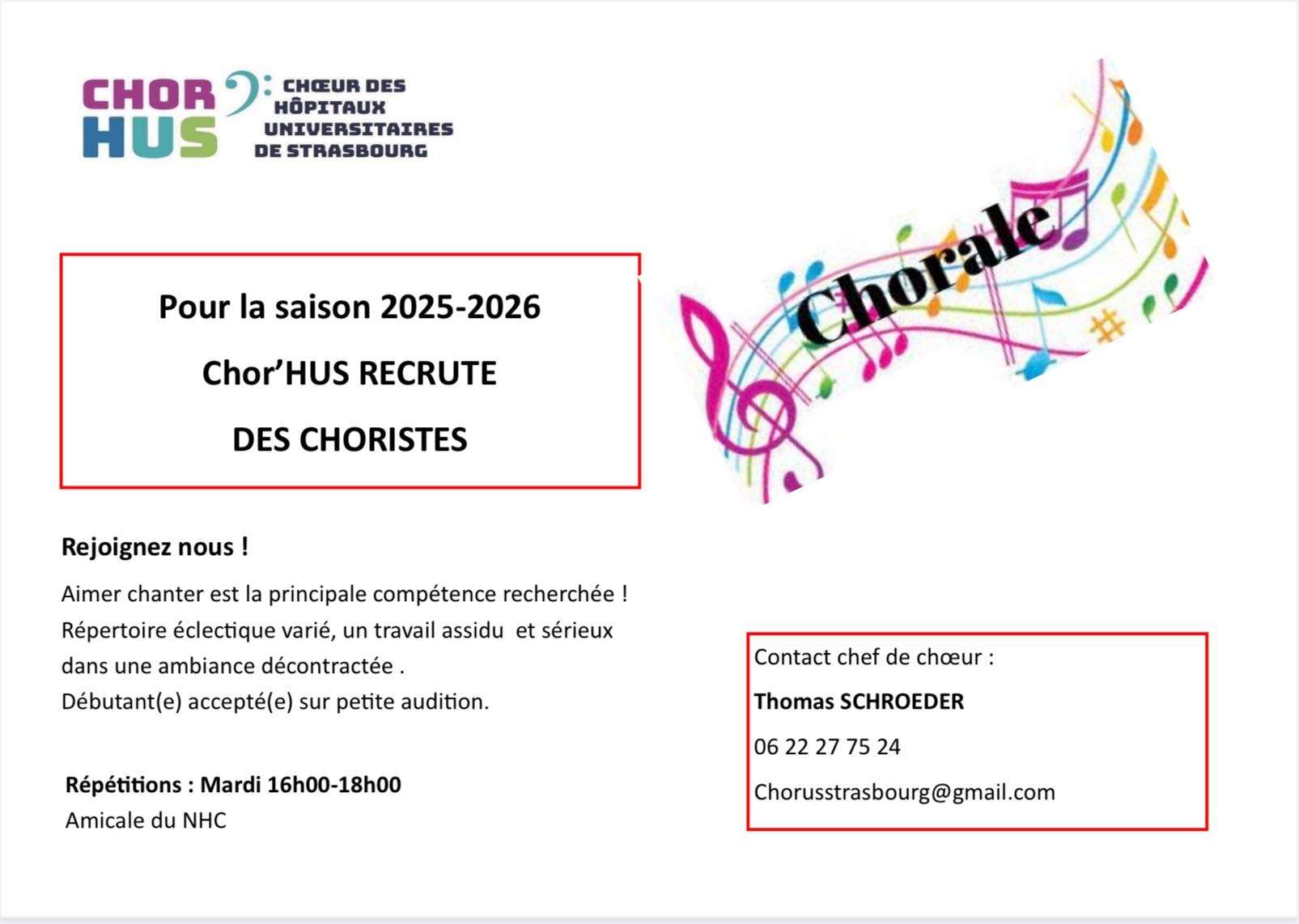 Chœur cherche choristes StrasbourgPublié le 15/09/2025 Chor'HUS recrute des choristes dans tous les pupitres Débutant·e·s accepté·e·s