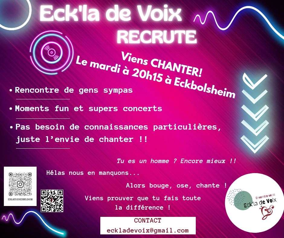 Chœur cherche choristes EckbolsheimPublié le 29/10/2025 Eck'la de Voix recrute Pour aller plus loinFacebook