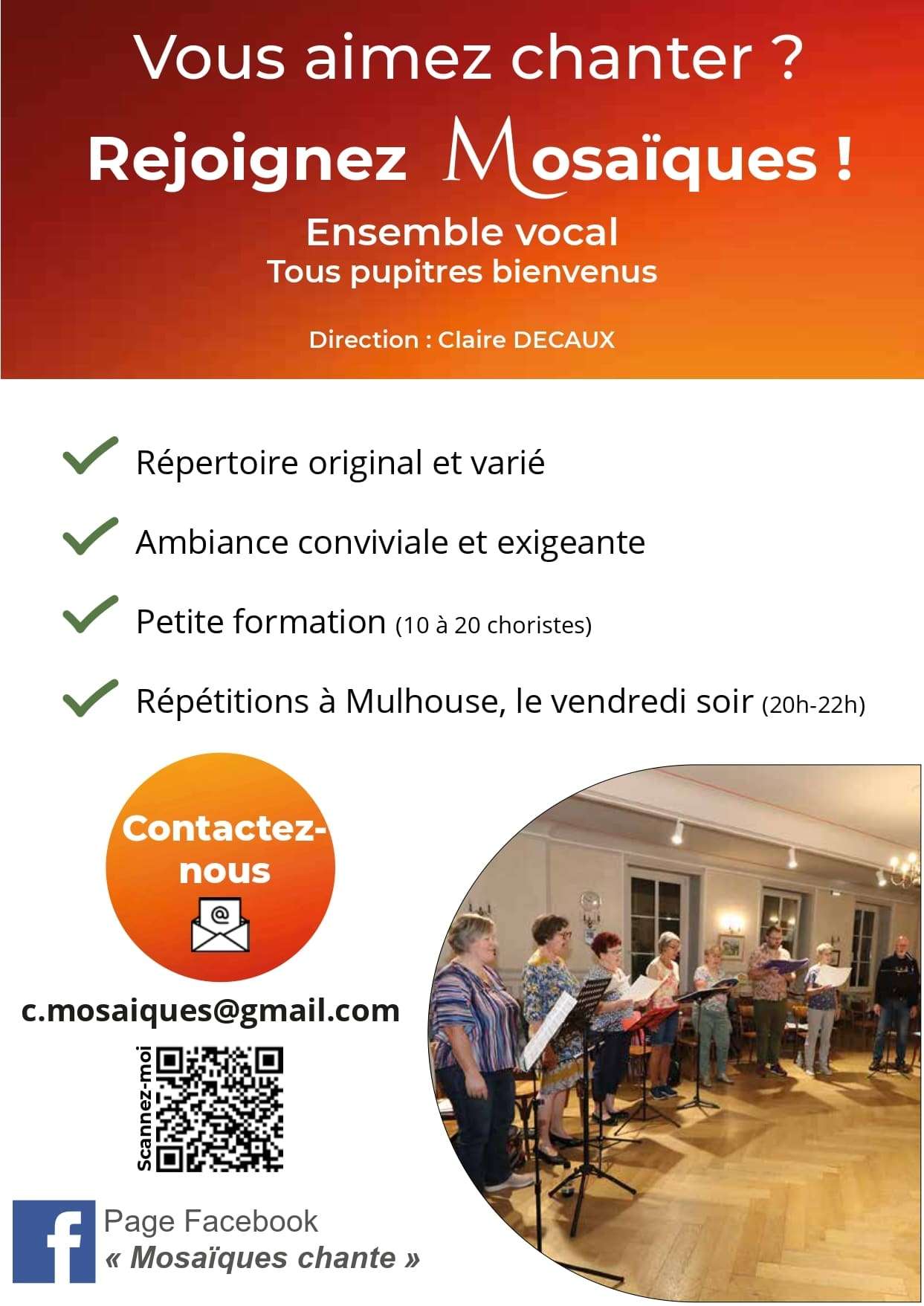 Chœur cherche choristes MulhousePublié le 11/09/2025 L'Ensemble Vocal Mosaïques recherche des choristes