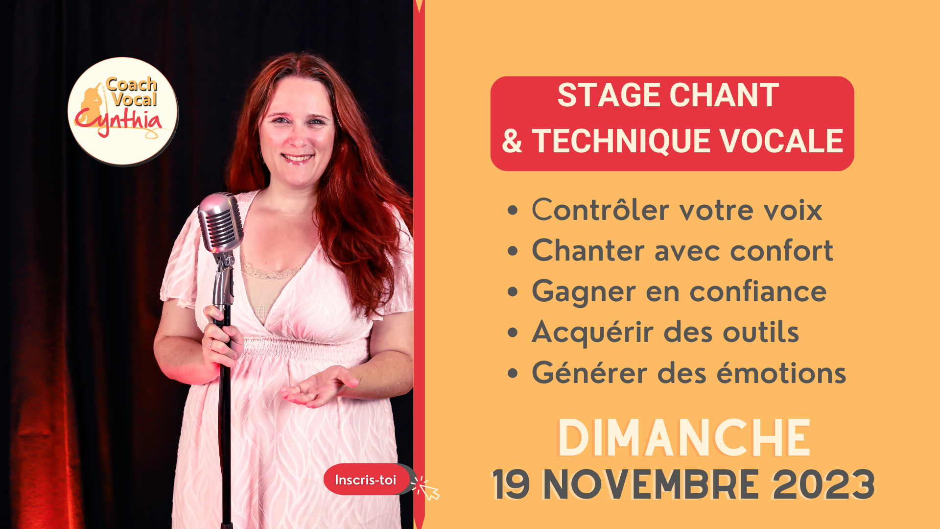 Dim. 19 Nov. 2023 09:30 Un stage d'une journée en petit comité pour améliorer votre technique vocale Stage chant & technique vocale avec Cynthia Colombo