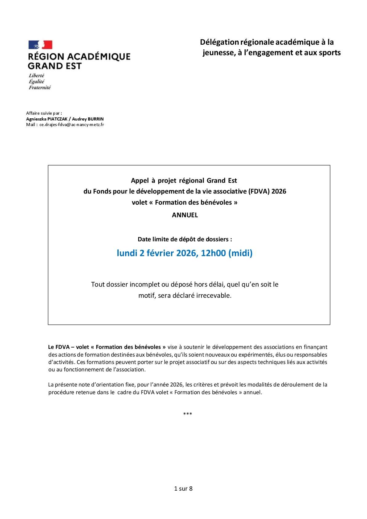 Date limite d'envoi des dossiers : 2 février 2026 à midi